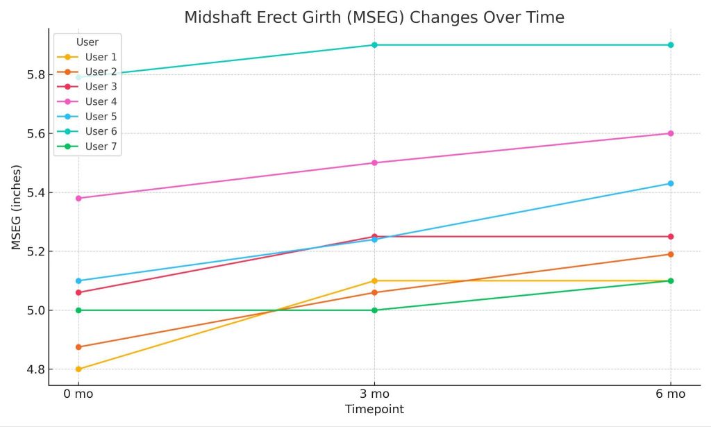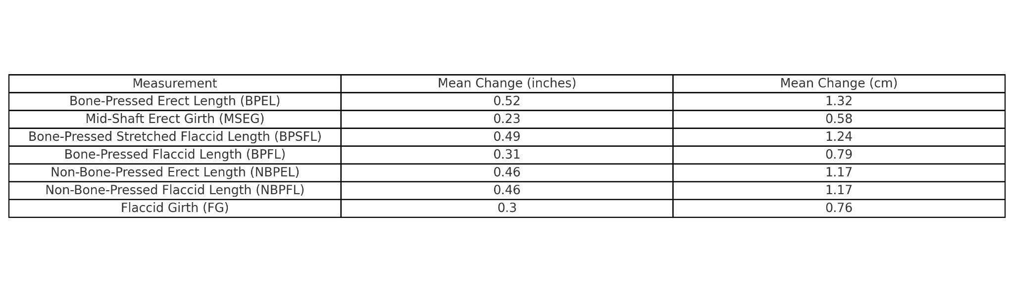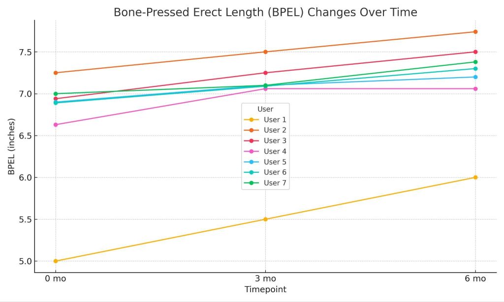 The average baseline bone-pressed erect length (BPEL) was 6.6 inches (16.76 cm), and the average mid-shaft erect girth (MSEG) was 5.14 inches (13.06 cm). Following the intervention, statistically significant increases were observed across multiple penile dimensions. The mean BPEL increased by 0.52 inches (1.32 cm), and the mean MSEG increased by 0.23 inches (0.58 cm). Additional gains were recorded in bone-pressed stretched flaccid length (BPSFL) (+0.49 inches, 1.24 cm) and bone-pressed flaccid length (BPFL) (+0.31 inches, 0.79 cm). Non-bone-pressed measurements demonstrated parallel improvements, with both non-bone-pressed erect length (NBPEL) and non-bone-pressed flaccid length (NBPFL) increasing by 0.46 inches (1.17 cm). Mean flaccid girth (FG) also increased by 0.30 inches (0.76 cm).