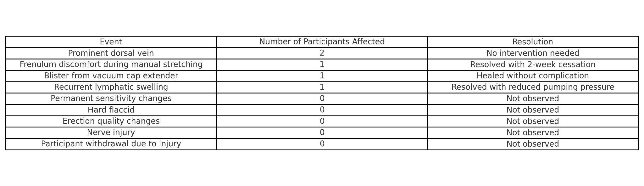 No significant adverse events were observed during the trial period. Two participants noted the development of a more prominent dorsal vein, which was not associated with pain, dysfunction, or adverse clinical outcomes. One participant reported mild discomfort localized to the frenulum during manual stretching exercises; symptoms resolved fully following a two-week interruption in activity, after which the participant successfully resumed the intervention protocol without recurrence. Another participant developed a superficial blister secondary to the use of a vacuum cap extender attachment; the lesion healed without complication, and the participant continued with the assigned regimen. One participant experienced recurrent lymphatic swelling beginning in the fourth month of trial participation; the symptoms resolved spontaneously following a reduction in negative pressure during pumping sessions. Importantly, no participants exhibited any permanent structural or functional penile changes, including alterations in tactile sensitivity, the development of hard flaccid, deterioration in erection quality, or signs of neurovascular injury. Furthermore, no participants withdrew from the study due to penile injury or adverse effects.