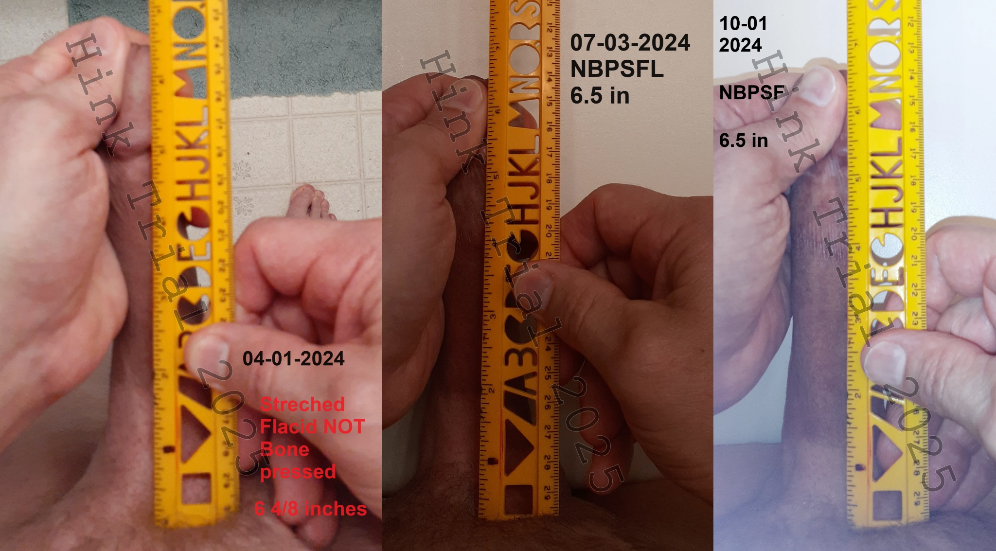 All participants provided written informed consent to document and share the entirety of their enlargement process, including the reporting of adverse events and the submission of standardized pre- and post-intervention photographic evidence. Prior to study initiation, participants were trained in standardized measurement protocols, encompassing bone-pressed erect length (BPEL), non-bone-pressed erect length (NBPEL), mid-shaft erect girth (MSEG), bone-pressed flaccid length (BPFL), and flaccid mid-shaft girth (FG). Measurements were systematically collected at baseline, three months, and six months. To control for potential measurement artifacts related to transient post-exercise edema, all measurements were required to be performed no sooner than two hours following any enlargement exercises.