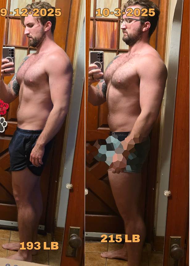 - Weight: 193 → 215 lb in weeks, mostly glycogen + water.