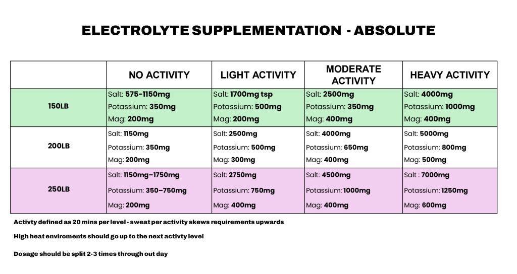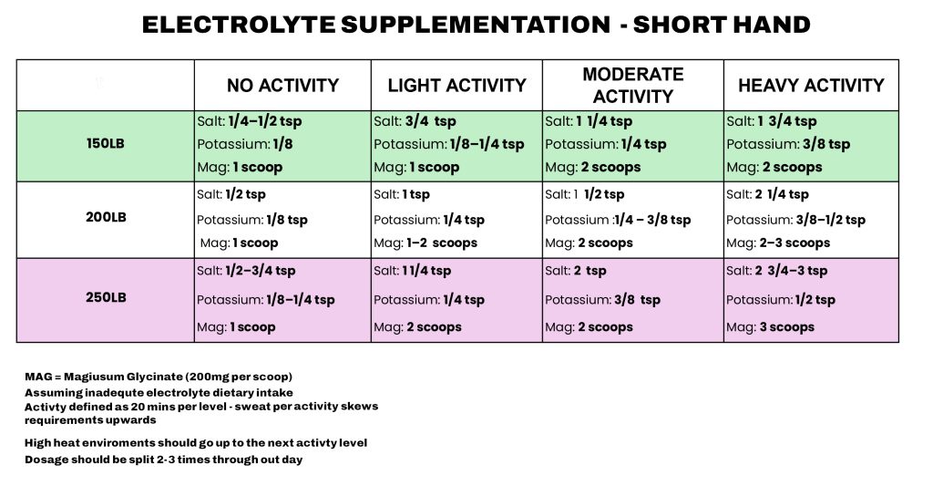 I would recommend taking salt, potassium, and magnesium pre-workout. If you don’t train… your needs are wildly different than mine. So please do not copy me 1:1 in general. There will be a table at the end to help you dial it in. Additionally, if you have any dietary or cardiac or kidney issues… talk to your doctor before you pound salts like me